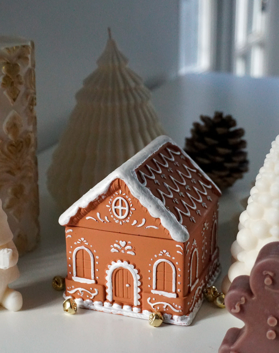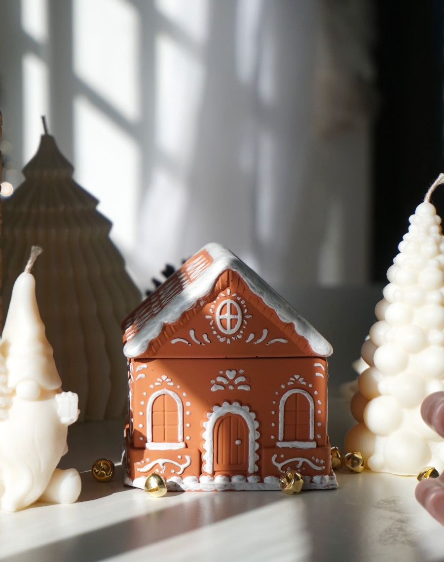 Laissez-vous charmer par la bougie Maison, une bougie délicatement façonnée en jesmonite, évoquant la chaleur et la magie des fêtes. Sa forme de petite maison en pain d’épices, ornée de détails blancs nacrés peints à la main, en fait une véritable pièce décorative au charme hivernal.